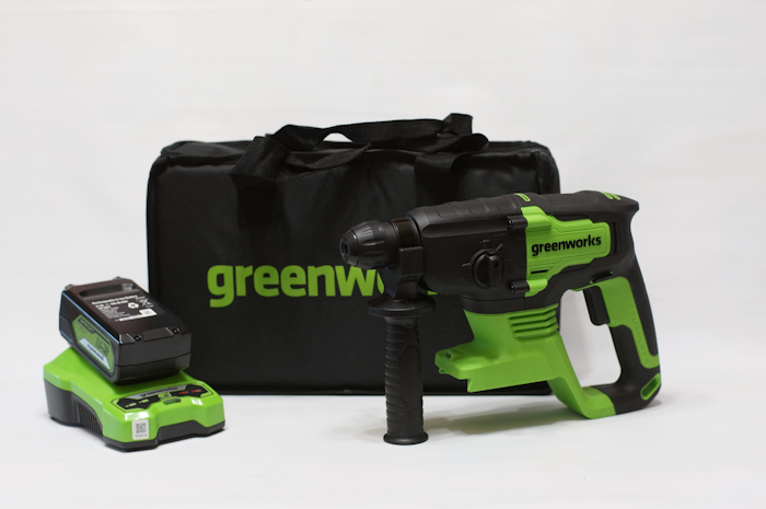 Перфоратор аккумуляторный GreenWorks GD24SDS2K4 (3803007UB) – это инструмент, который обеспечивает эффективное бурение и долбление различных материалов. Он работает от аккумуляторной батареи, что позволяет использовать его в разных местах.