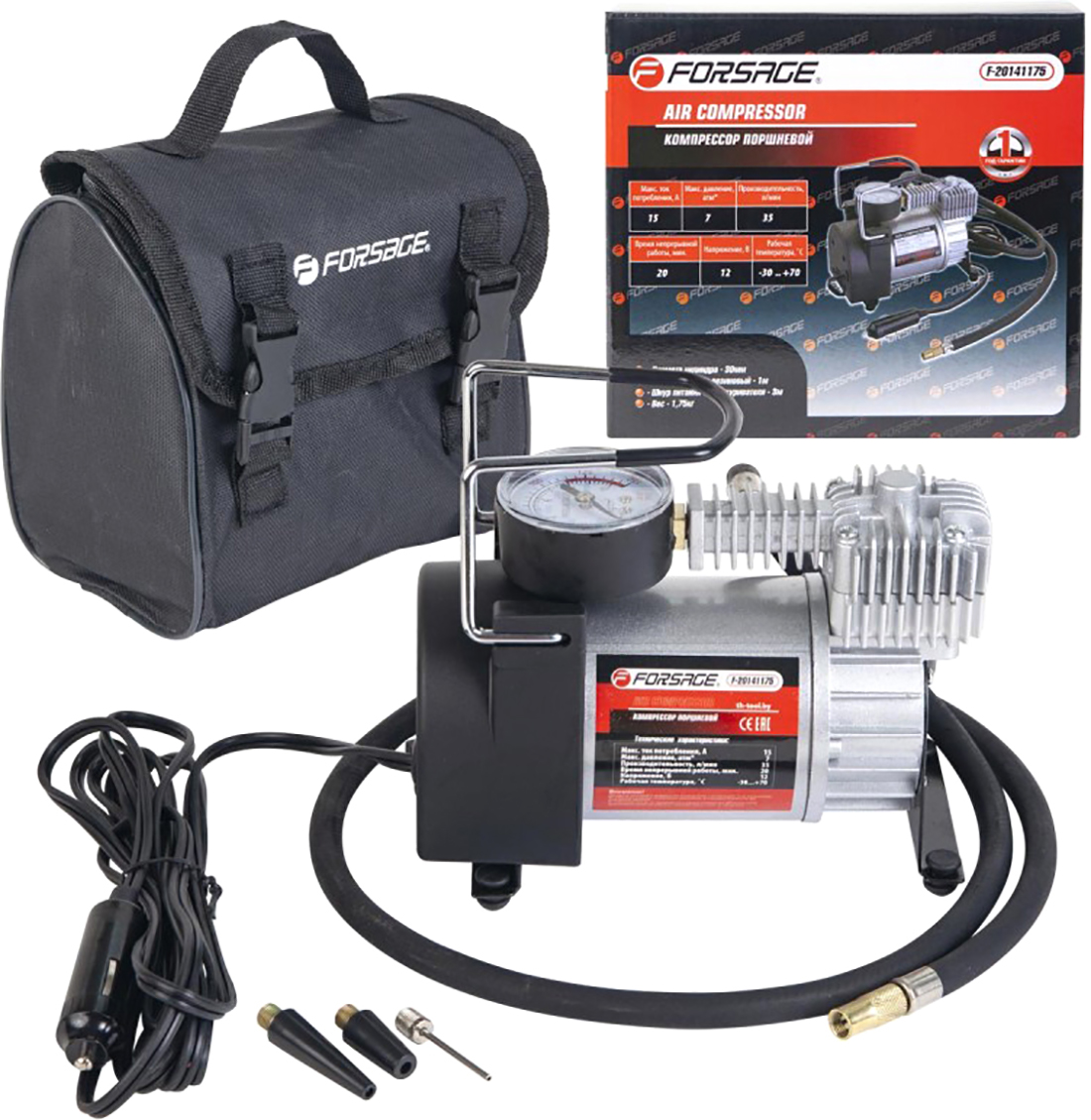 Forsage F-20141175 - оборудование для подачи сжатого воздуха производительностью 35 л/мин. Оно легко накручивается на колесо и может быть использовано в сложных погодных условиях. Встроенный механический манометр позволяет отслеживать фактическое рабочее давление. Его максимальное значение может составлять 10 атм.