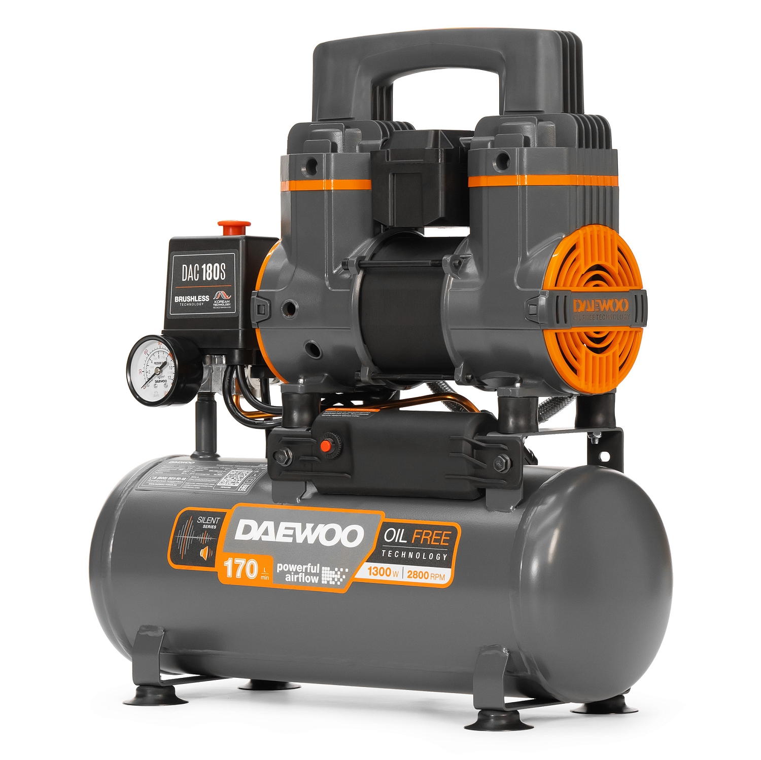 Daewoo DAC 180S - стационарная установка мощностью 1300 Вт и производительностью 170 л/мин. Она оборудована бесщеточным двигателем, разработанным специально для техники такого типа. Благодаря воздушным фильтрам установка оперирует большим объемом воздуха, не перегревается и при этом достигает стабильно высокую производительность.
